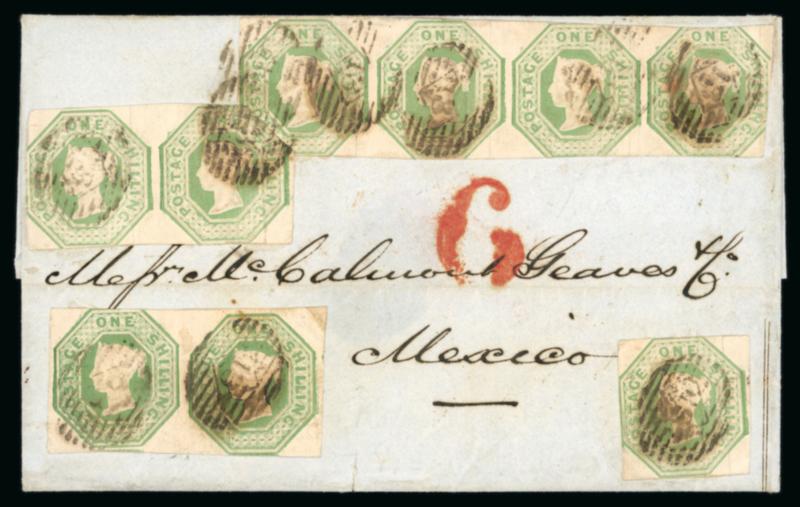1851 (Aug 2) entire to Mexico bearing embossed 1s green in strip of four, two pairs and a single to form the 9s rate for up to 2oz by British Packet, tied by London inland numeral ''13'' cancels. Margins are touched in places, one pair with a reduced corner which slightly overlaps the strip. Additio
