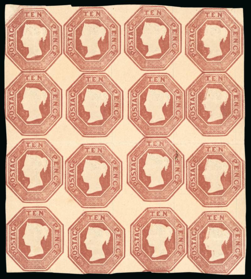 1848 10d brown, die II, in an incomparable and simply stunning block of 16, good margins mostly all round (just touched in a few places) large part original gum and displaying lovely fresh colour; some creasing as to be expected of a multiple this size, though in no way detracting from the fine app