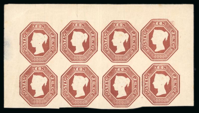 1847-54 10d brown, die 3, a magnificent mint block of eight from the top of the sheet, wonderfully fresh showing deep and bright colour and superb embossing, large to enormous margins all around (just clear in two places at foot), full original gum and only hinged at the top leaving all the stamps m