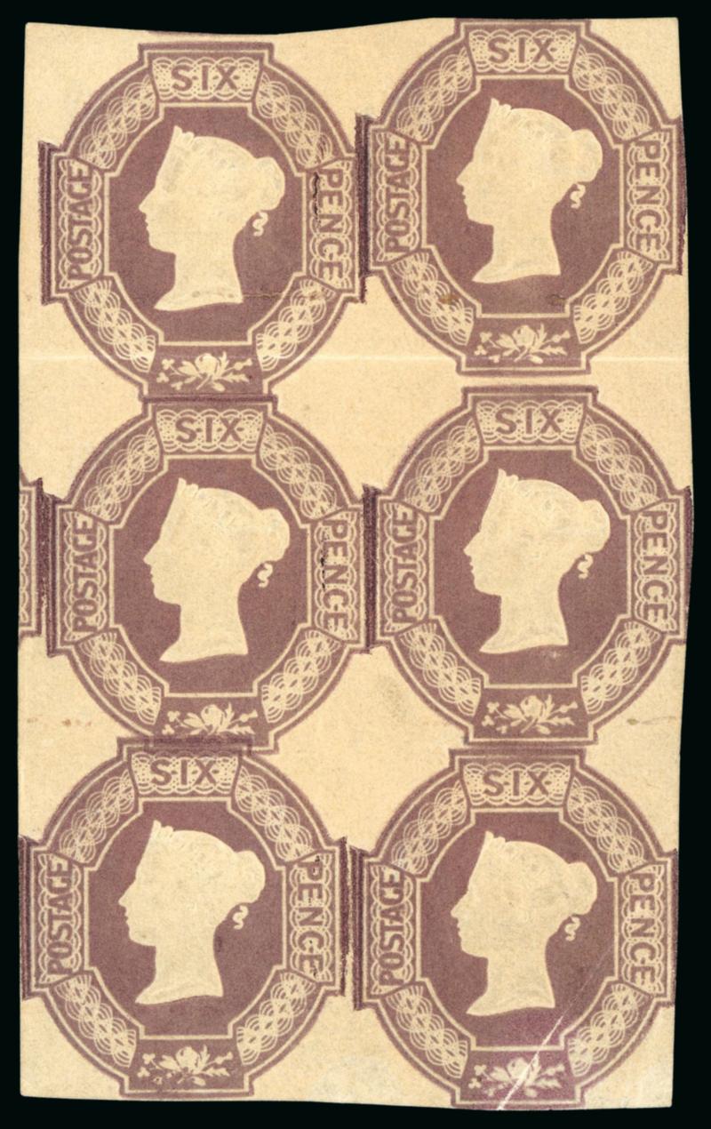 1854 6d mauve in a superb mint vertical block of six, jut touched to clear margins all round, with large part original gum, folded through the top pair and corner crease at lower right though not affecting the fine appearance of this stunning exhibition show piece, a great rarity, being the largest