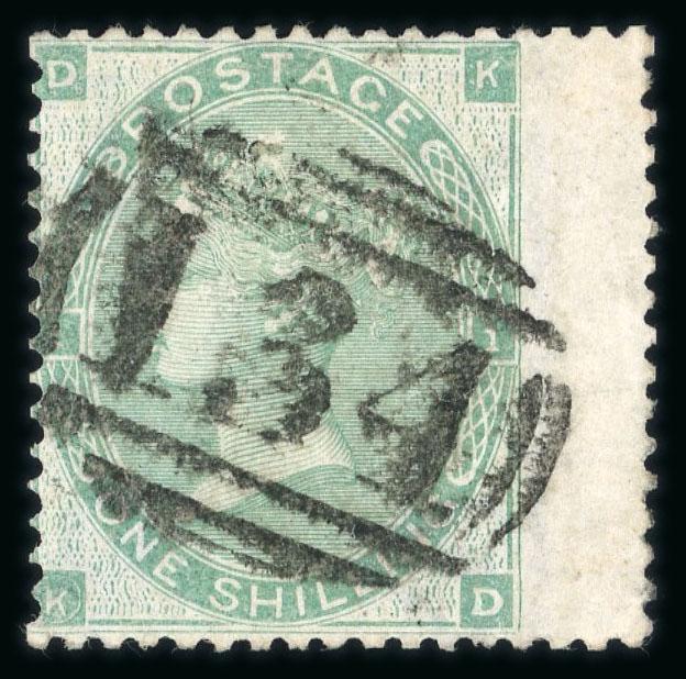 1862-64 1s green, plate 1, lettered KD and showing "K" in white circle plate variety, good to fine used wing marginal single with clear central "134" numeral of Bristol, a scarce example of the plate error (SG £2'750)