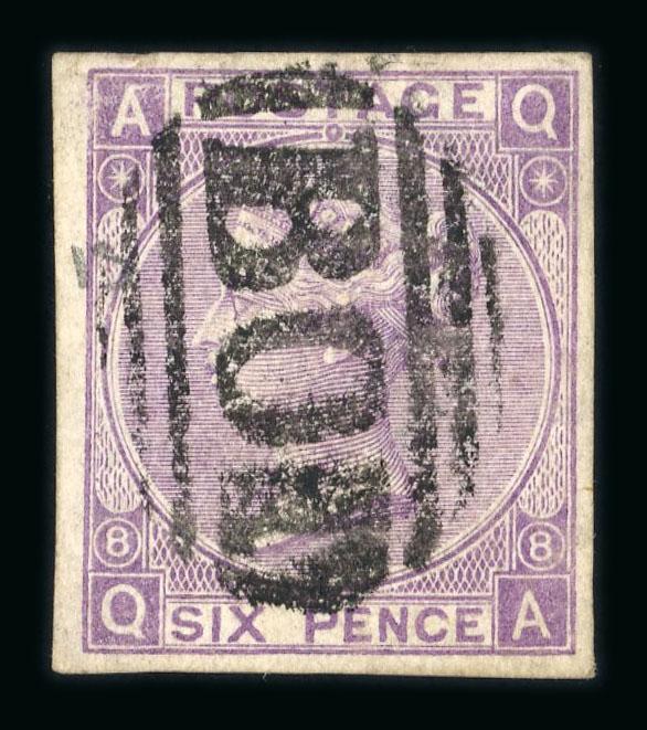1869 6d. dull violet, QA, Pl. 8, variety imperforate, neatly cancelled by a complete "BO1" obliterator of Alexandria Egypt, according to Latto this was used as a trial cancel. Rare.