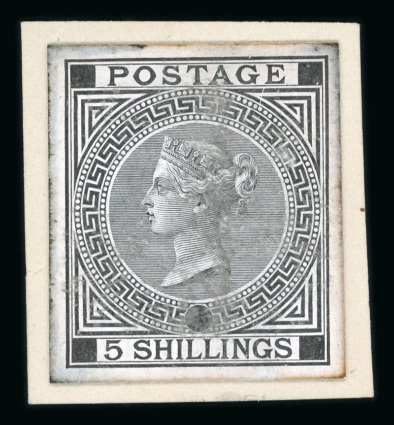 1867 5/- stamp size die proof in black on glazed card, with uncleared corner squares and plate number circle, mounted on card, some rubbing at face though very rare.