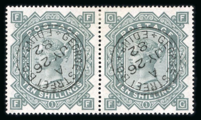 1867-83 wmk MC 10s greenish grey used pair, each with crisply struck "George Street Edinb" JU 26 82 (Scotland) cds, a superb and very scarce multiple; ex "Victoriana" (S.G. £6'400+).
