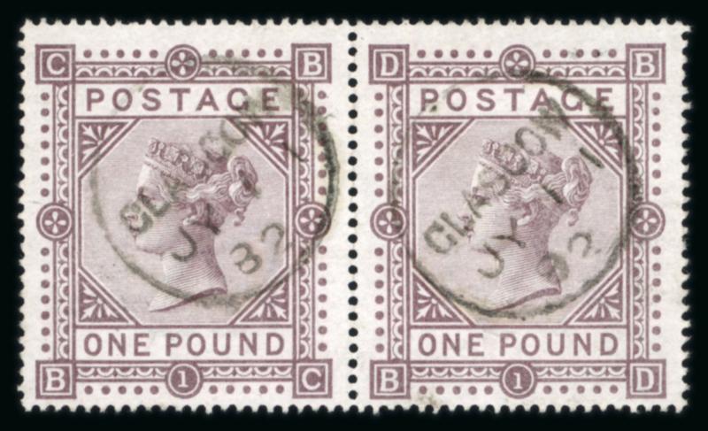 1867-83 wmk MC £1 brown-lilac in used pair, each with fine Glasgow JY 11 82 (Scotland) cds, few pairs are known, a superb and very scarce item; cert. Brandon (2106) (S.G. £9'000+).