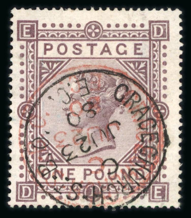 1867-83 £1 brown-lilac DE used example neatly cancelled by fine strikes of the Greenchurch St cds in both red and black, tiny tear at right near E, rare.