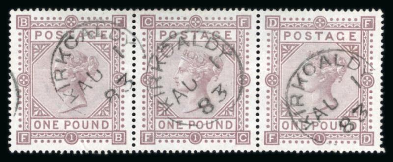 1882 £1 brown-lilac pl.1 FB-FD horizontal used strip of three, neatly cancelled by Kirkcaldy cds; a fine and very Rare multiple. Cert R.P.S. (2003). Note: This strip adjoins the one in the Royal collection.