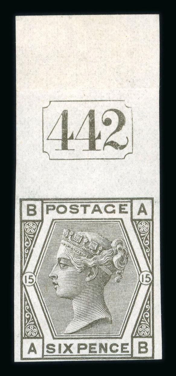 1873-80 6d. deep-grey, AB, Pl.15, imperforate imprimatur from the top of the sheet (cut close at foot) and showing "442" current number; superb mint NH (mounted in the margin only) ink mark on reverse not affecting the fresh and fine appearance. Unique.