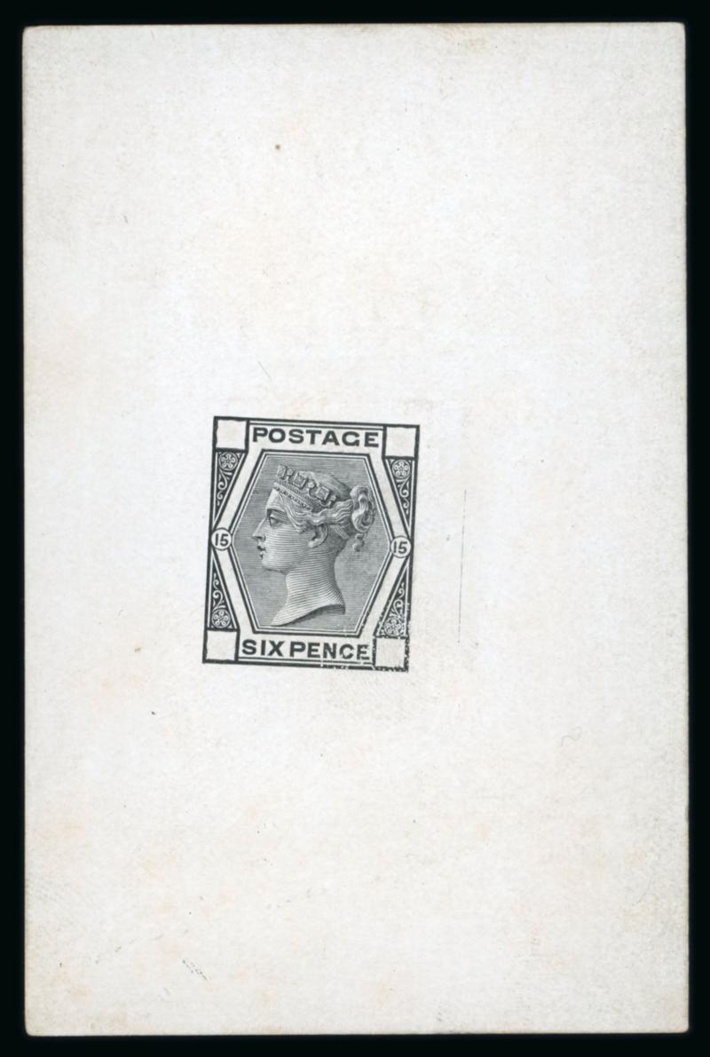 1874 6d. stamp size die proof in black on glazed card with void corner squares from the striking book; rare.