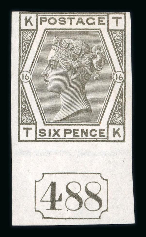 1873-80 6d. deep-grey, TK, Pl.16, imperforate imprimatur from the foot of the sheet (cut close at top) and showing "488" current number; large part OG; fresh and fine appearance. Unique.