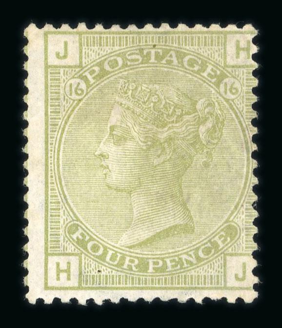 1873-80 Large Garter 4d sage-green pl 16 JC mint with full original gum, one faintly toned perf., a superb example; cert. B.P.A. (2013) (S.G. £1'400).