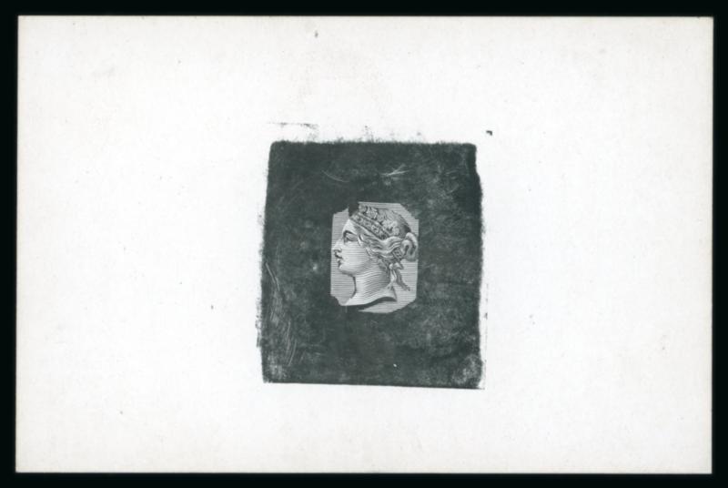 1879 Tender essay "Theed" head die proof A, in black on glazed card 60 x 92mm; fine.