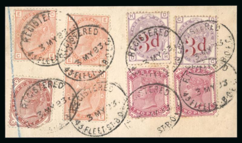 1880-83 3d on 3d lilac, two singles, plus 1s orange-brown, plate 14, three singles and three other values, all neatly tied by clear strikes of the oval REGISTERED/FLEET STREET/3.MY.83 ds, on fragment, unusual and attractive.