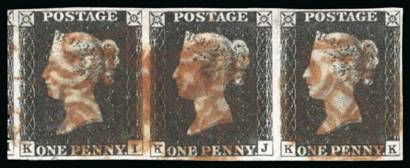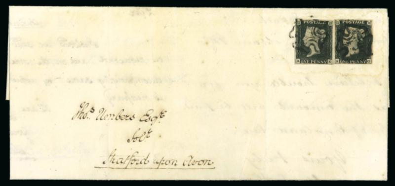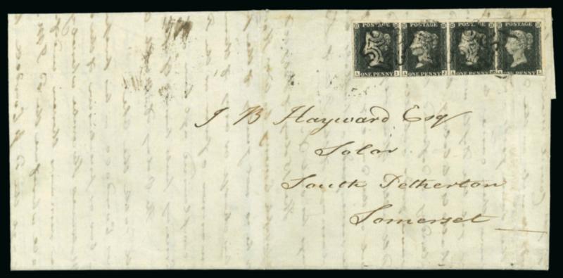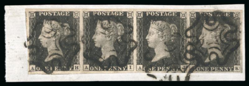 1840 1d Black pl.1b complete plate reconstruction of the sheet of 240 stamps from AA to TL, all with four margins, including a strip of six, a block of four (creased), two horizontal pairs and one vertical pair, the rest being fine to very fine singles (incl. two with inverted watermarks), many with