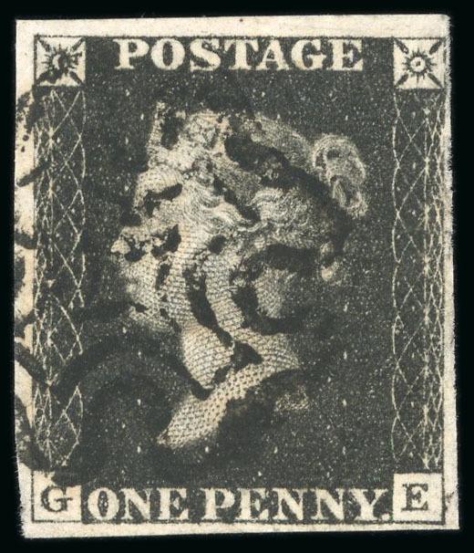 1840 1d black pl.1a SJ, four good to large margins, cancelled by a black Maltese cross which is much scarcer on this plate than the S.G. catalogue value suggests especially in this shade, light blue ink mark on face, very fine (S.G. Spec AS1f £1'100).