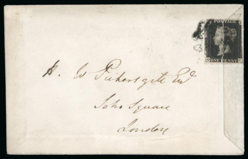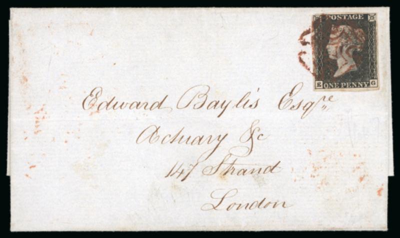 1840 (May 15) reduced cover, franked with 1d black pl.2 CE, four margins close at side otherwise good, cancelled by a Maltese cross in red which is visible from behind the stamp (giving confidence the stamp belongs); sent from Gloucester to London (S.G. £3'500).