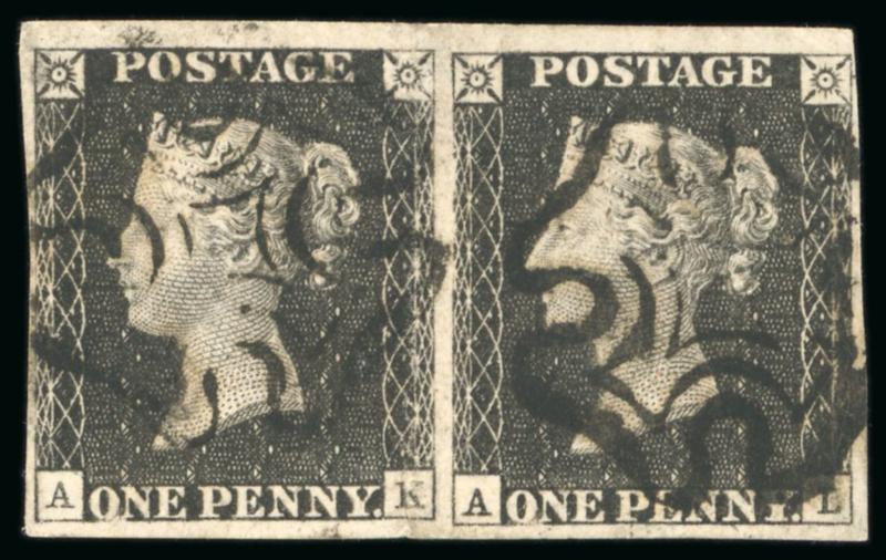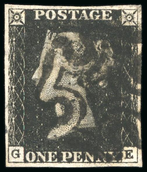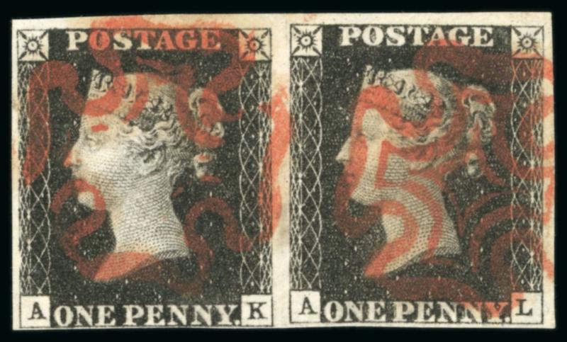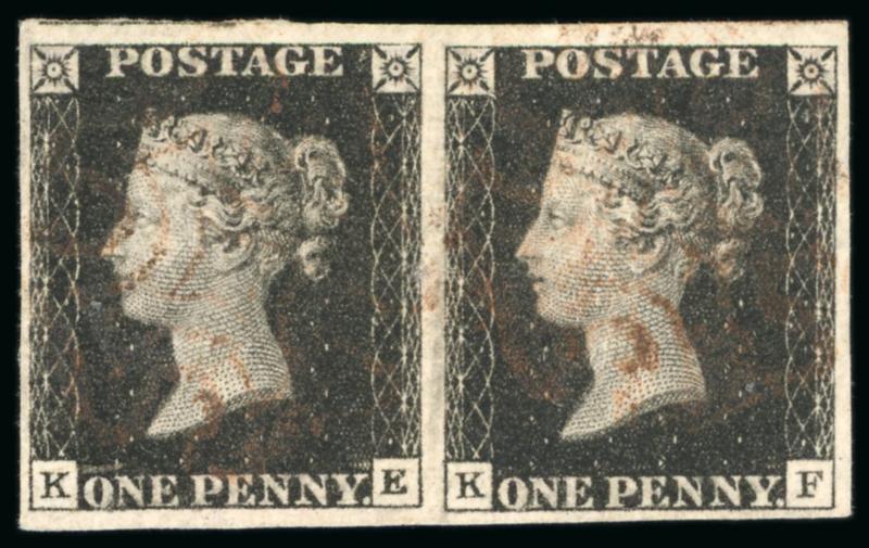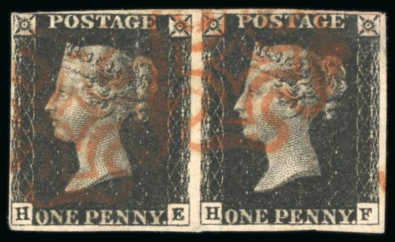 1840, 1d black pl.2 GE with four margins and red MC, matched with 1d red pl.2 GE, close to large margins and black MC, a fine duo (S.G. £750).
