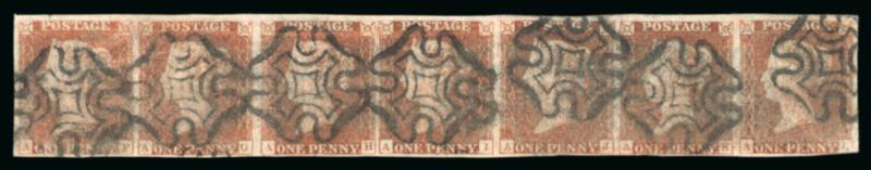 1854 1d rose-red pl.59 wmk Large Crown perf.14 in upper marginal strip of 11 (12th stamp removed) with full marginal inscription and plate numbers, some toning and creasing, an attractive and scarce multiple.