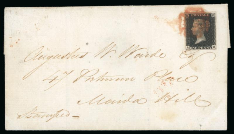 1840, 1d black pl.1a AK with four margins on lettersheet sent within Scotland to Edinburgh cancelled by fine a complete strike of the red MC, reverse with a fine strike of Fushie Bridge JN 22 blue boxed and Edinburgh JUN 23 1840 arrival, minor soiling, fine.