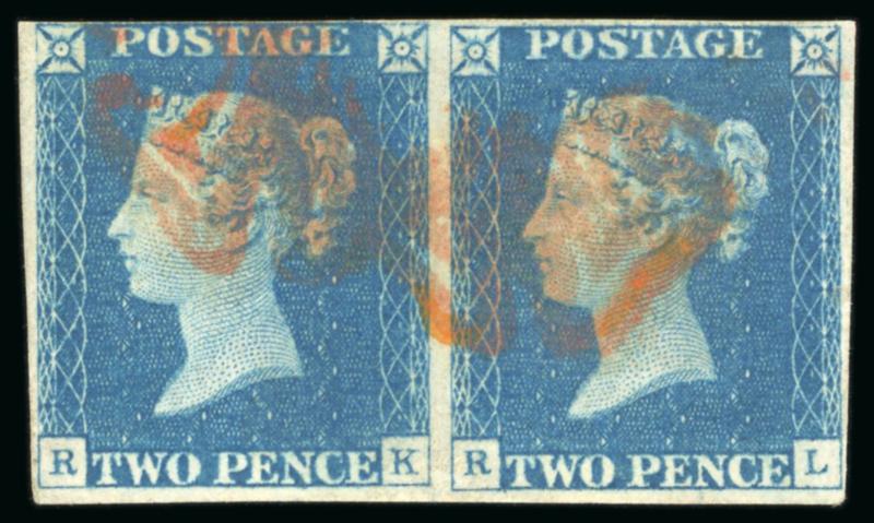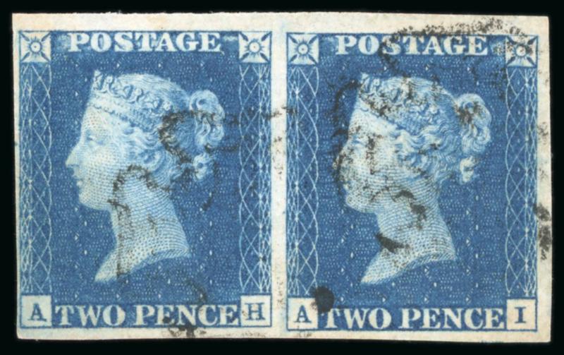 1840 2d blue pl.2 AH-AI horizontal pair with clear to very large margins, light black MCs, a fine and impressive multiple (S.G. £2'500).
