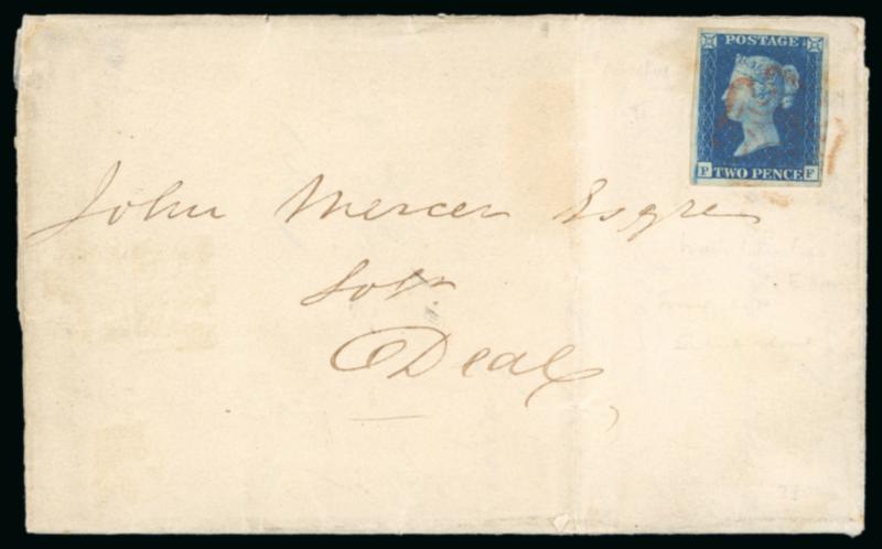 1840 2d deep full blue pl.2 PF, with good to large margins all round, neatly tied to entire by red Maltese cross addressed to Deal (Kent), the reverse with a Ramsgate cds (JA.19.1841), a very scarce cancellation on this plate.