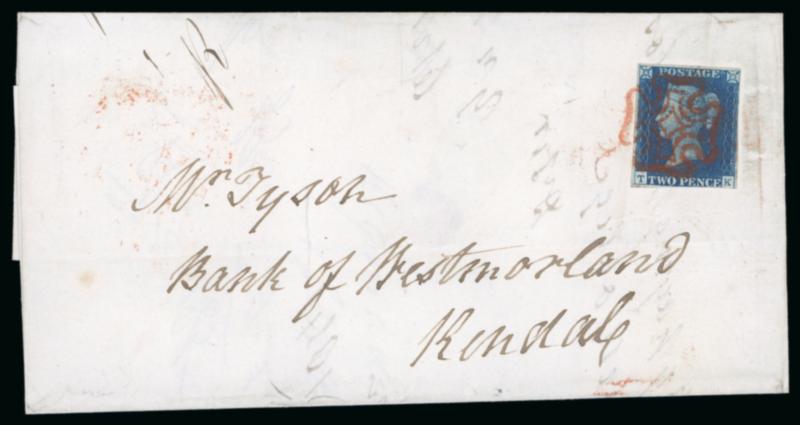 1840, 2d blue pl.2 TK, just cut into at foot otherwise clear margins, tied to 1841 (Jan 4) wrapper from Kirby Lonsdale to Kendal by very fine strike of the red MC, crisp despatch bs, an attractive and scarce usage of the red MC on a 2d plate 2.