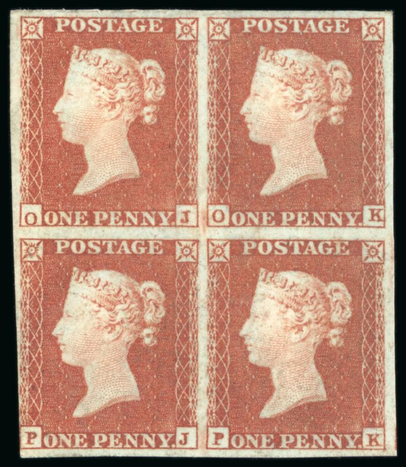 1841 1d red OJ/PK, wmk small Crown, blued paper, mint o.g. block of four, just touching at lower left otherwise good margins, light horizontal bend along top, fine with vibrant colour and fresh appearance (S.G. Spec. £3'200).