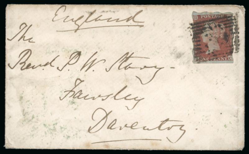 1841 1d red-brown "Treasury" roulette on cover to Daventry tied indistinct Scottish numeral, backstamped Invercannich and green "22 9 53" transit of Beauly, green Daventry arrival marks, a little soiling and torn backflap, a very scarce Scottish usage; cert. RPS (1947) and cert. BPA (2023) (S.G. £20