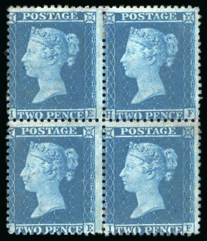 1854-57 2d blue pl.6 HE/IF, wmk LC, perf.14, in mint block of four, fine and rare multiple (S.G. Spec. £17'000).