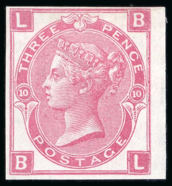 1867-80 Large Uncoloured Corner Letters, Wmk Spray of Rose. 1873 3d rose pl.10 BL imperforate imprimatur, mint o.g., very fine and rare, one of only 22 possible examples many of which are in institutional collections.