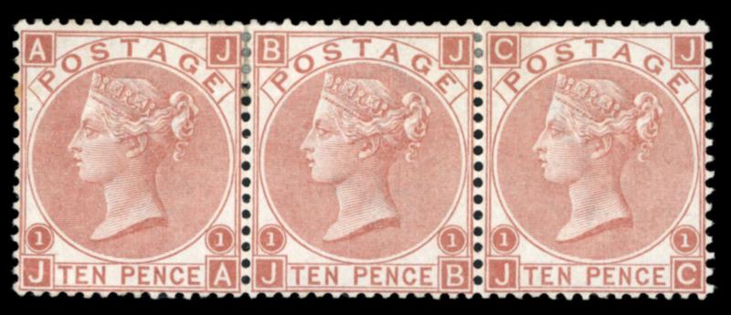 1867 10d red brown pl.1 JA-JC mint horizontal strip of three, large part o.g., corner crease at the lower left of JA not detracting from the very fine appearance of this magnificent multiple (S.G. £10'800 as singles).
