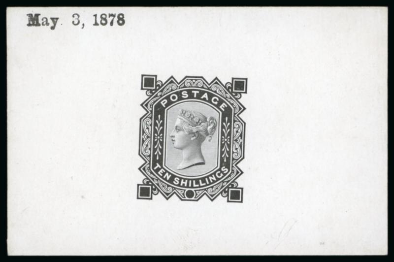1867-83 High Values. 1878 10s De La Rue die proof in black on white glazed card, 92x60mm, dated "Apr 30, 1878", very fine and rare.