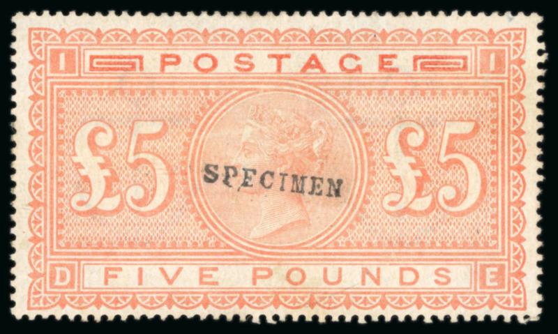 1882 £5 Orange on blued paper, pl.1 AG, overprinted “SPECIMEN” type 9, mint o.g. with small trace of hinge, very fine; cert BPA (2002).