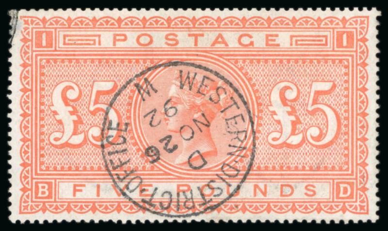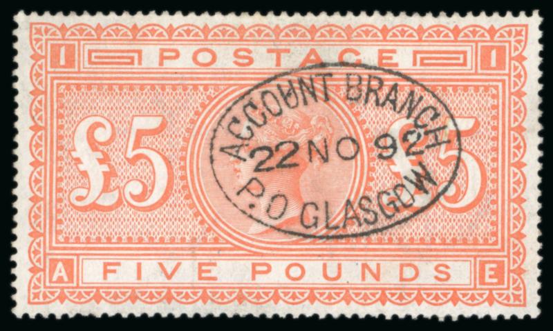 1867-83, £5 orange AE used with neat "ACCOUNT BRANCH / GLASGOW" 22 NO 92 oval cancel, a fine and attractive example (S.G. £3'500).