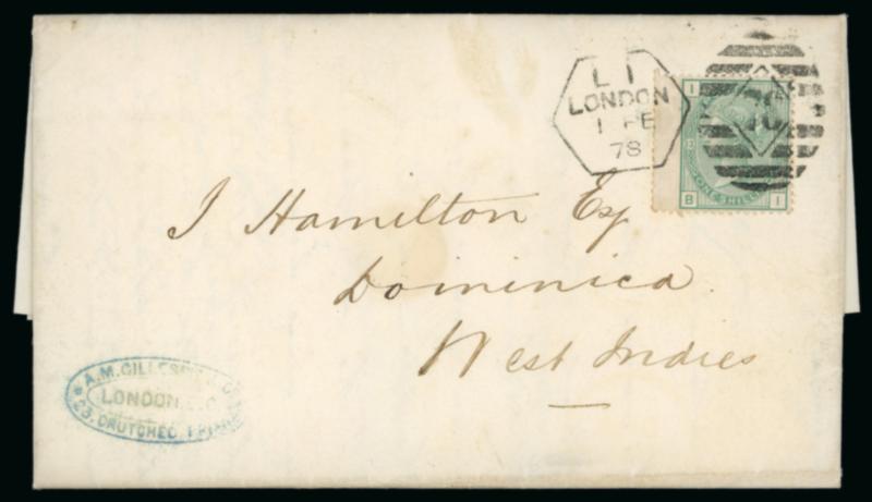 1878 (Feb 1) entire from London to Dominica with 1873-80 1s wing marginal tied by London "78" "L1" duplex, Dominica arrival bs, some insignificant soiling, fine and scarce destination.