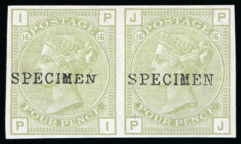 1873-80, 4d sage-green pl.15 imperf. horizontal pair with "SPECIMEN" type 9 ovpt, very fine.