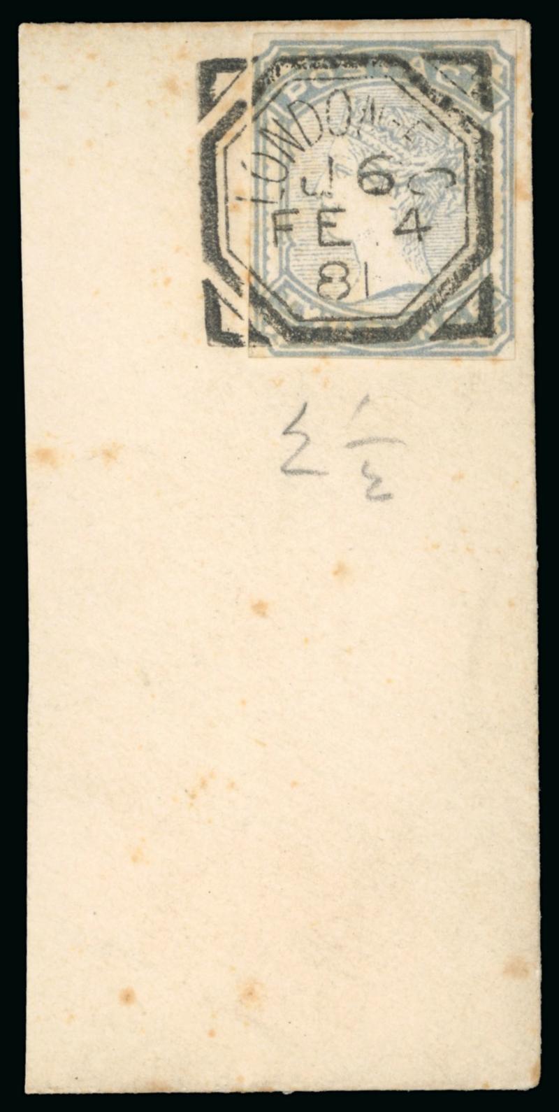 1880-81 Provisional Issue and 1881 1d Lilac. 1880-81 2d in pale green on imperforate white paper affixed to small piece of white card (35x76mm), tied by an experimental London E.C. squared circle trial cancellation, ms "2 1/2" below, minor foxing, very rare.