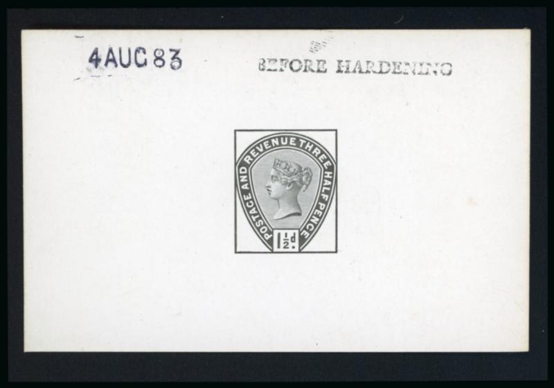 1883-84 Lilac & Green Issue. 1883-84 Lilac & Green issue 1 1/2d die proof in black on white glazed card, 90x60mm, endorsed "BEFORE HARDENING" and dated "4 AUG 1883", very fine and very scarce.
