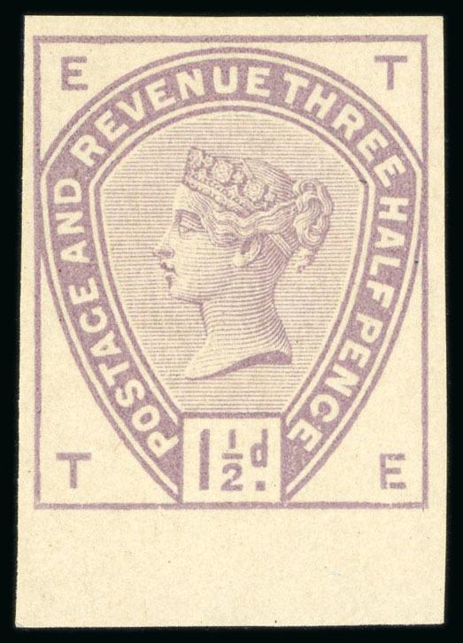 1884 1 1/2d colour trial in lilac on buff paper, imperforate from the bottom of the sheet, very fine with large part o.g., scarce.
