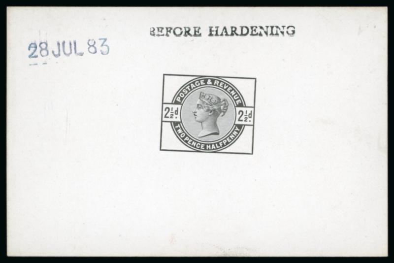1883 2 1/2d De La Rue die proof in black on glazed card, 92x60mm, without corner letters, dated “28 JUL 83” and endorsed “BEFORE HARDENING”, scarce.