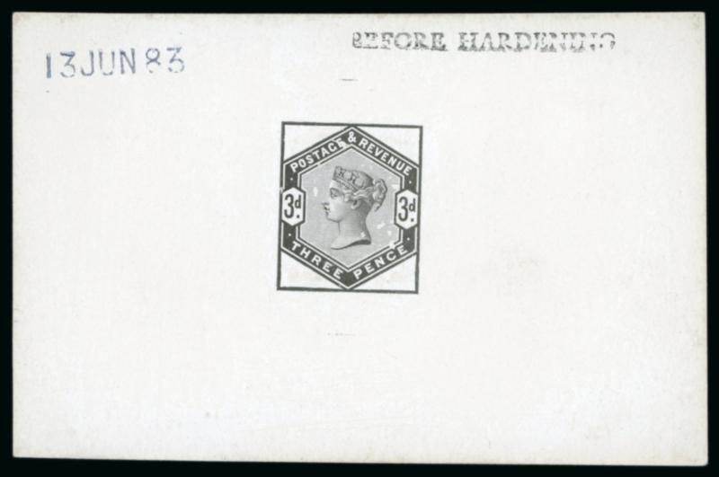 1883 3d De La Rue die proof in black on white glazed card (90x60mm) without corner letters, endorsed "BEFORE HARDENING" and dated "13 JUN 83", very scarce.