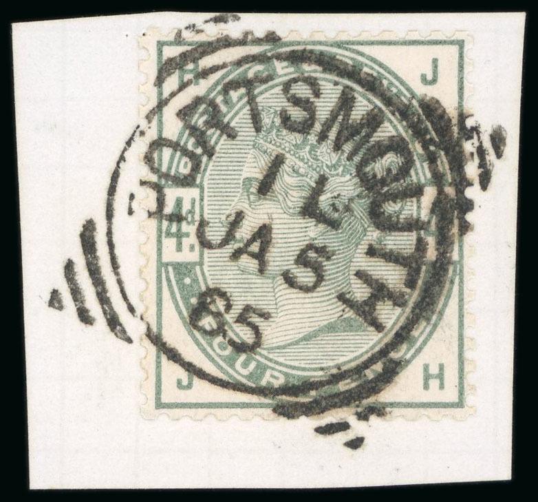 1884 4d dull green JH tied top small piece of De La Rue archive page by crisp Portsmouth "IL" JA 5 85 squared circle trial cancellation, very fine and thought to be unique in private hands, ex "Verus" (see Wiseman's "De La Rue Years" vol.2 p.249).