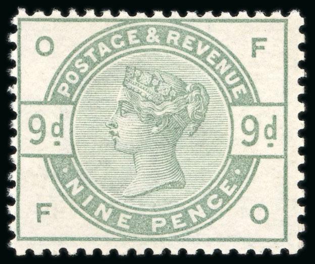 1883 9d dull green FO, variety watermark inverted, superb fresh mint n.h., a lovely example of this rare watermark variety.
