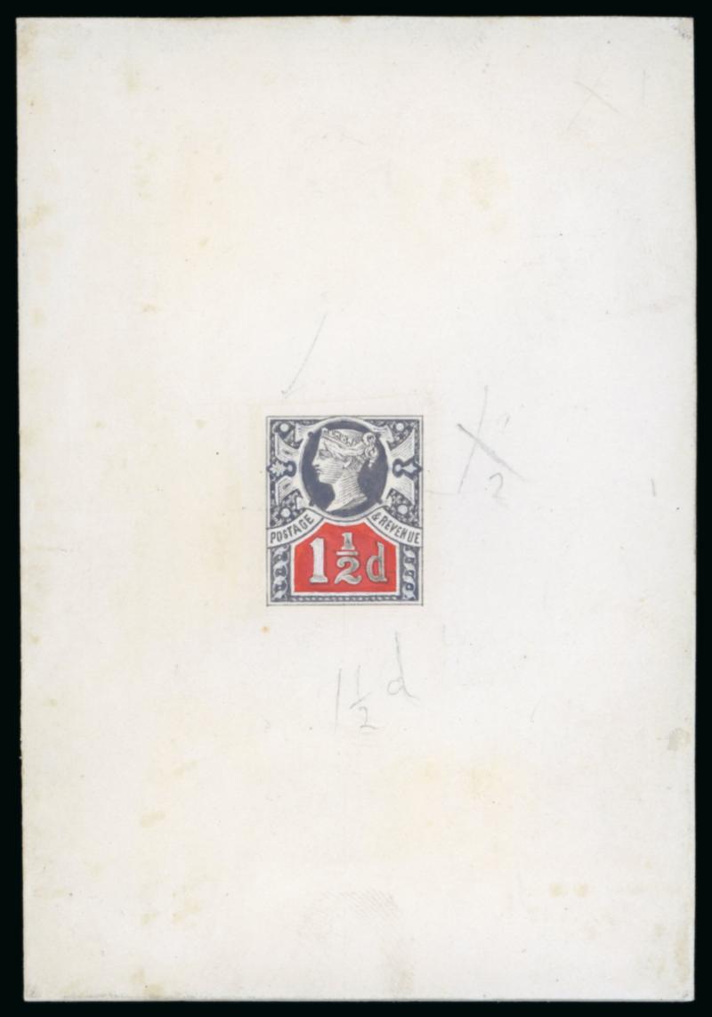 1887-1900 Jubilee Issue & 1891 £1 Green. 1887-1900 Jubilee Issue 1 1/2d handpainted essay in dull lilac and carmine with details highlighted in Chinese white, on white card 80x116mm, a beautiful and unique essay.