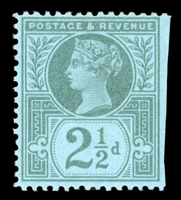 1887-1900 Jubilee issue 2 1/2d perforated colour trial in green on blue crown watermarked paper, imperforate at right, mint o.g., very fine and rare.