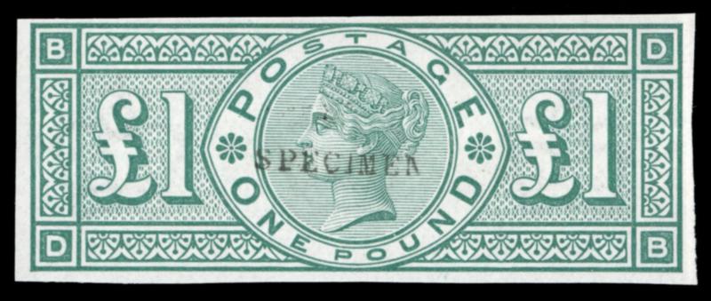 1891 £1 green DB imperforate overprinted "SPECIMEN" type 9, mint n.h., very fine and very fresh example without any of the usual heavy creasing normally seen on these rare Specimens (S.G. Spec. K17s).