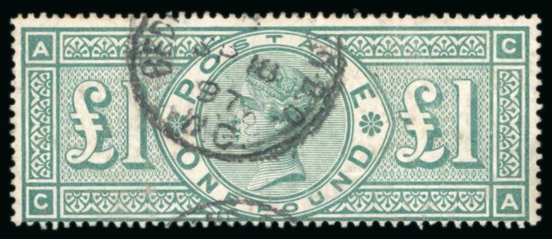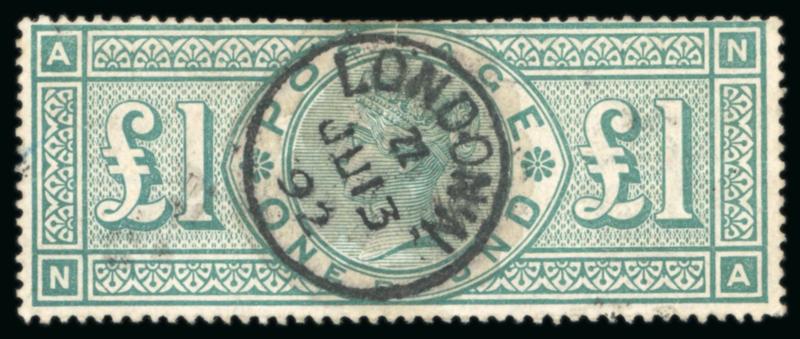 1891 £1 green, used with central LONDON/JU.13.92 cds, plus another with boxed parcel cancel, a few faults on both, fine (S.G. £1'600).