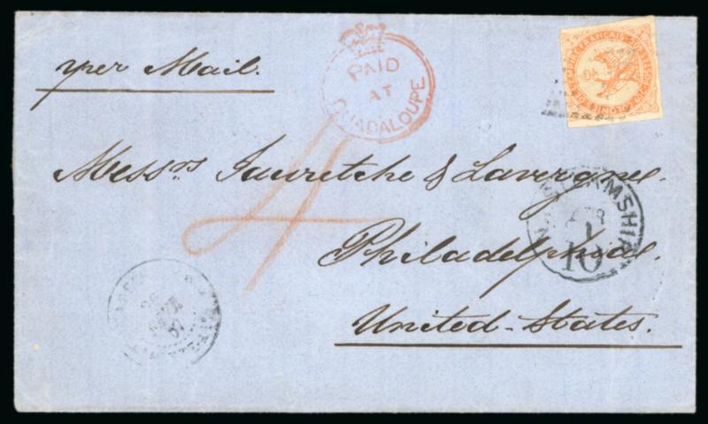 Guadeloupe: 1867 (Feb 25) wrapper to the USA, with British double arc despatch on reverse and "PAID / AT / GUADELOUPE" crown circle hs on obverse, with French Colonies 40c Eagle (2 margins, vertical filing fold affecting stamp) and next day French Guadeloupe cds, rated "4", with St. Thomas transit b