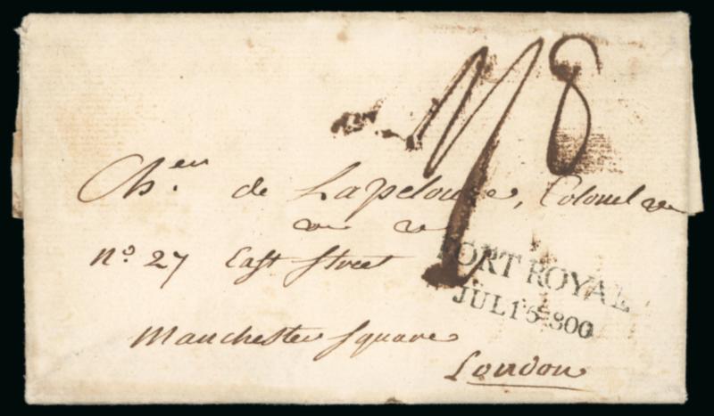 Martinique: 1800 (Jul 16) entire from Fort Royal to England with very fine two-line British "FORT ROYAL / JUL 16 1800" ds, ms "1/8" rate, reverse with London arrival and "10 o'Clock" ds, a great rarity of British West Indies postal history.