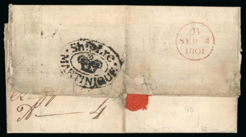 Martinique: 1801 (Jul 15) entire from Robert to England with bold British "Ship Lre / (crown) / MARTINIQUE" oval hs on reverse, London arrival, heavy vertical fold and soiling, extremely rare with only 2 or 3 covers known with this marking.